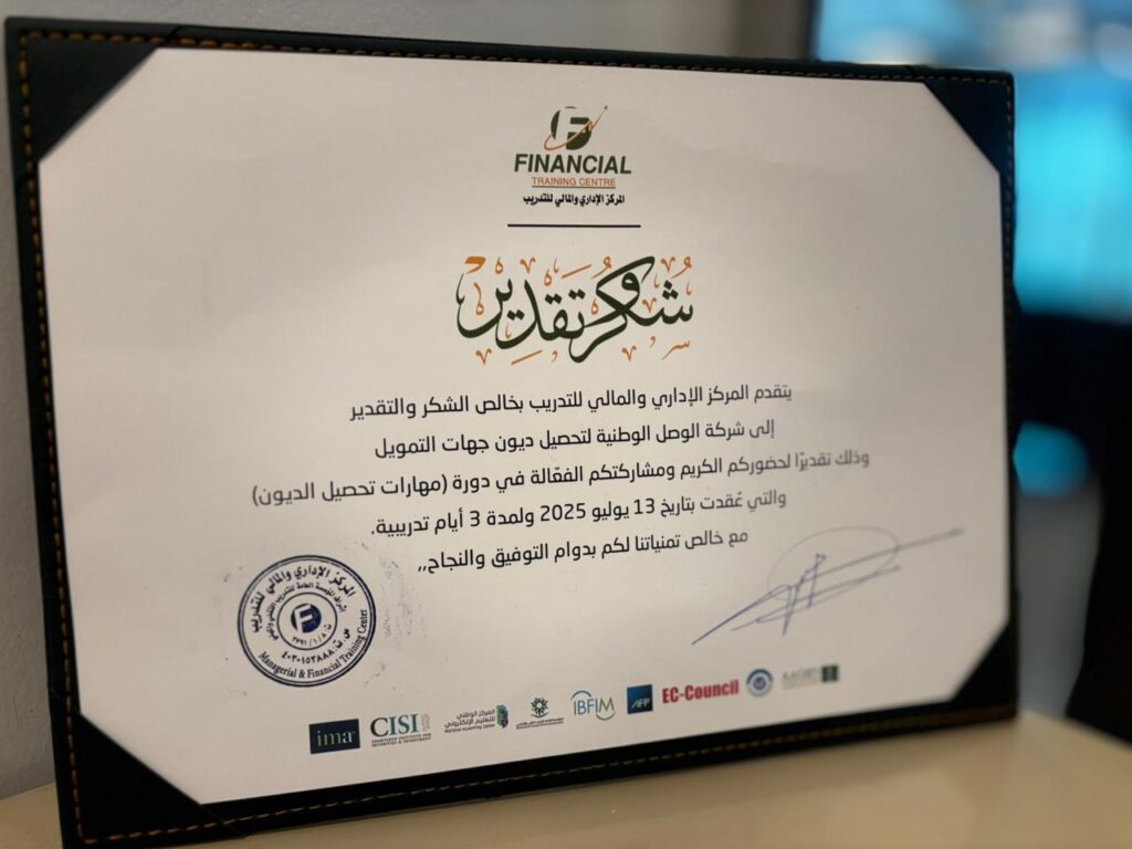 شهادة شكر من المركز الإداري والمالي في دورة مهارات تحصيل الديون لعام 2025م
